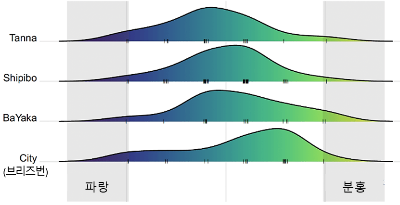 소규모 사회의 어린이들도 브리즈번의 어린이들처럼 분홍색을 선호할까? 결과는 매우 흥미로웠다. 세 소규모 사회의 어린이들은 성별과 무관하게 분홍색에 대한 특별한 선호도를 보이지 않았다. 그러니까 특별히 좋아하지도, 싫어하지도 않는다는 뜻이다. 하지만 도시의 소녀들은 아래 도표에서 보듯 분홍색을 선호하는 모습을 분명하게 보여준다.