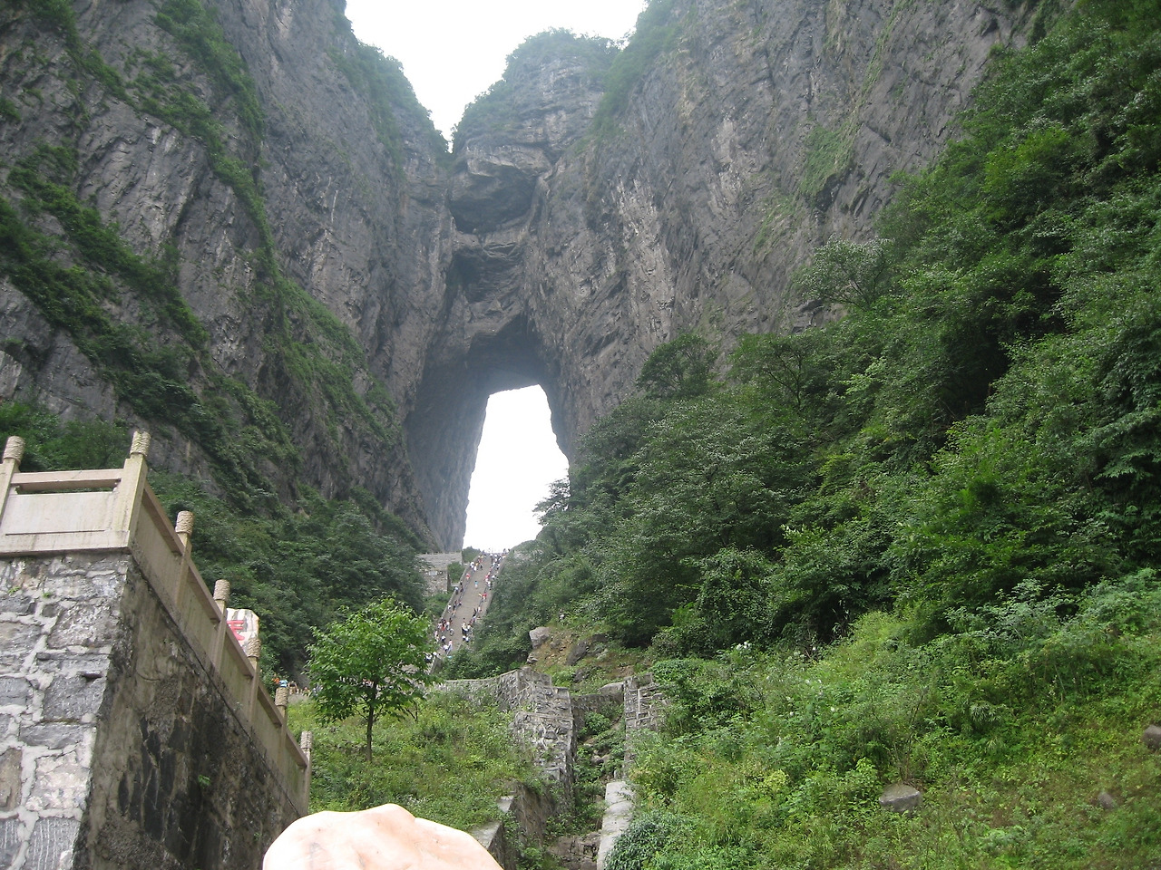 다음으로 명조 때 건립되었다는 천문 산사로 이동했다. 상서 지구의 불교 중심지이며 전체 사찰에는 관음당이 있다. 리프트에 몸을 매달고 천문산 중간으로 향했다. 그곳에서 산길만 다니는 전용 버스에 몸을 싣고 통천 대도의 길을 따라 하늘문이라고 하는 동굴을 찾았다. 절벽에 겨우 2대의 버스가 비킬 수 있는 포장된 길은 암벽을 깎기도 하고, 조금만 터널을 만들고, 눈 아래 석축을 쌓기도 하였다. 통천 대도의 길이는 11km 남짓하고 해발 200m에서 1.300m로 상승하는데 마치 용이 하늘로 치솟아 올라가는 형상이다. 발아래로 절경인데 30분 정도의 거리에 도착한 광장은 상천제다. 하늘 높이 1,000m의 절벽에 동굴이 뚫려 있는 곳까지 1.000개의 계단이 우리를 기다리고 있었다. 오르다가 허리를 펴는 관광객, 즐거운 표정으로 내려오는 관광객으로 혼잡하다.