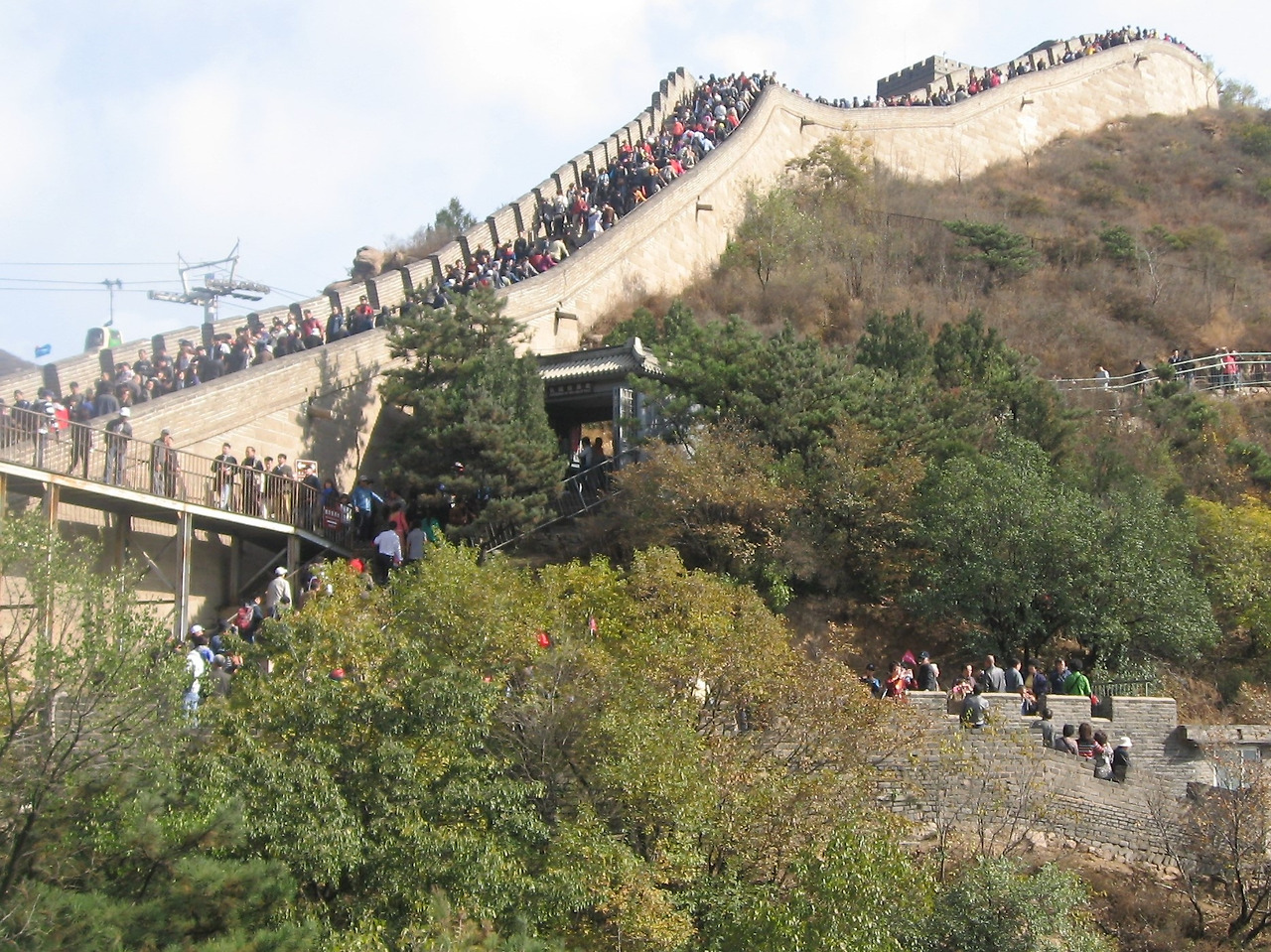 만리장성에 올랐다. 감탄사가 절로 나오는 인류 최대의 토목공사 현장이다. 중국 역대 왕조들이 북방 민족의 침입을 막기 위해서 세운 방어용 성벽이다. 이 성벽을 만들 때, 시멘트가 없어서 석회를 반죽하고 수수 가루를 섞어 아교처럼 사용하여 벽돌을 붙였다고 한다. 연장 길이가 약 5,000㎞ 이상이다. 동쪽에서 서쪽으로 길게 뻗어 있다. 군사적 방어선이자 문화적 경계이다. 그 규모와 기상이 놀랍다. 노력과 비용에 비해서 방어벽으로서의 역할은 크지 않았다. 그러나 만리장성은 중국을 대표하는 명물로 세계 7대 불가사의이다. 관리가 부실하여 주민들이 벽돌을 빼내 자기 집을 짓는 데 사용한 곳도 있다.
