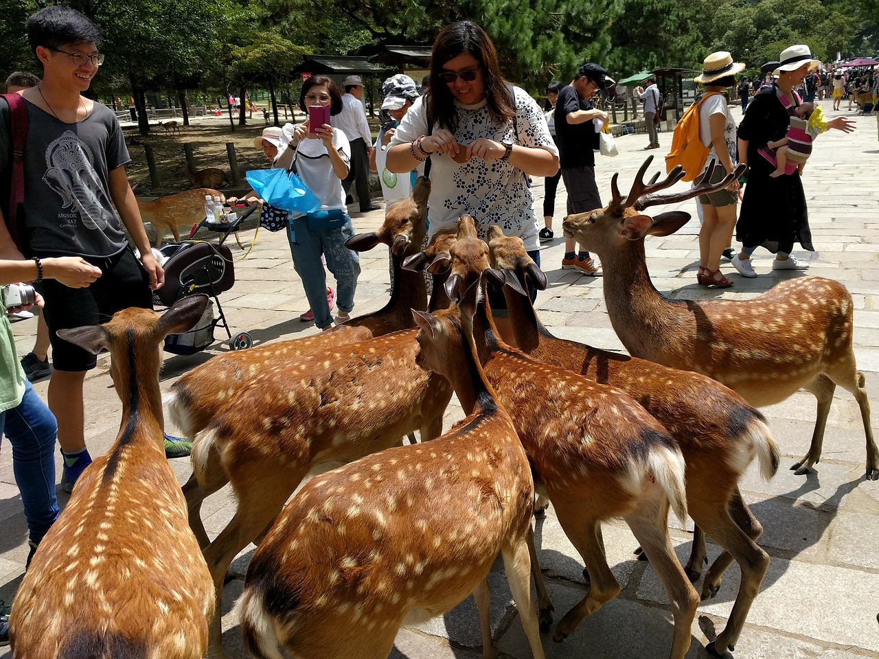 동대사 입구에는 1,200여 마리의 사슴이 방목되고 있었으며 관광객들이 과자를 주면 사슴들이 따라다니며 받아먹었다, 배가 부른 사슴 20여 마리가 나무 그늘에 옹기종기 모여 앉아 있고, 관광객들은 그 사이를 비집고 들어가 사진을 찍는데, 사슴들은 아랑곳하지 않고 평화롭게 졸고 있다.