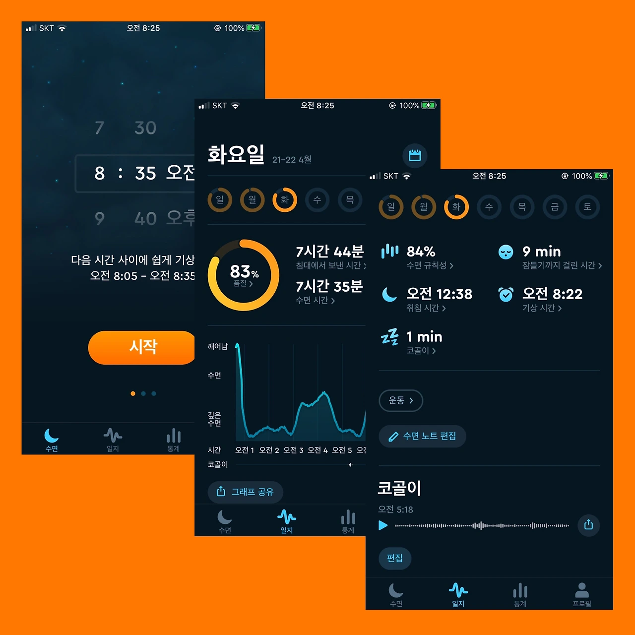 Sleep Cycle은 잠에 드는 순간부터 일어날 때까지 제 소리를 녹음합니다. 그래서 수면 패턴부터 코골이까지 온갖 TMI를 알 수 있죠. 심지어 유료 버전으론 코골이 하이라이트까지 들어볼 수 있다고요. 너무 부담스럽나요? 그치만 평생 동안 사람은 약 25년을 잔다는데, 우리 좀 더 행복한 수면 시간을 보내야지 않을까요?