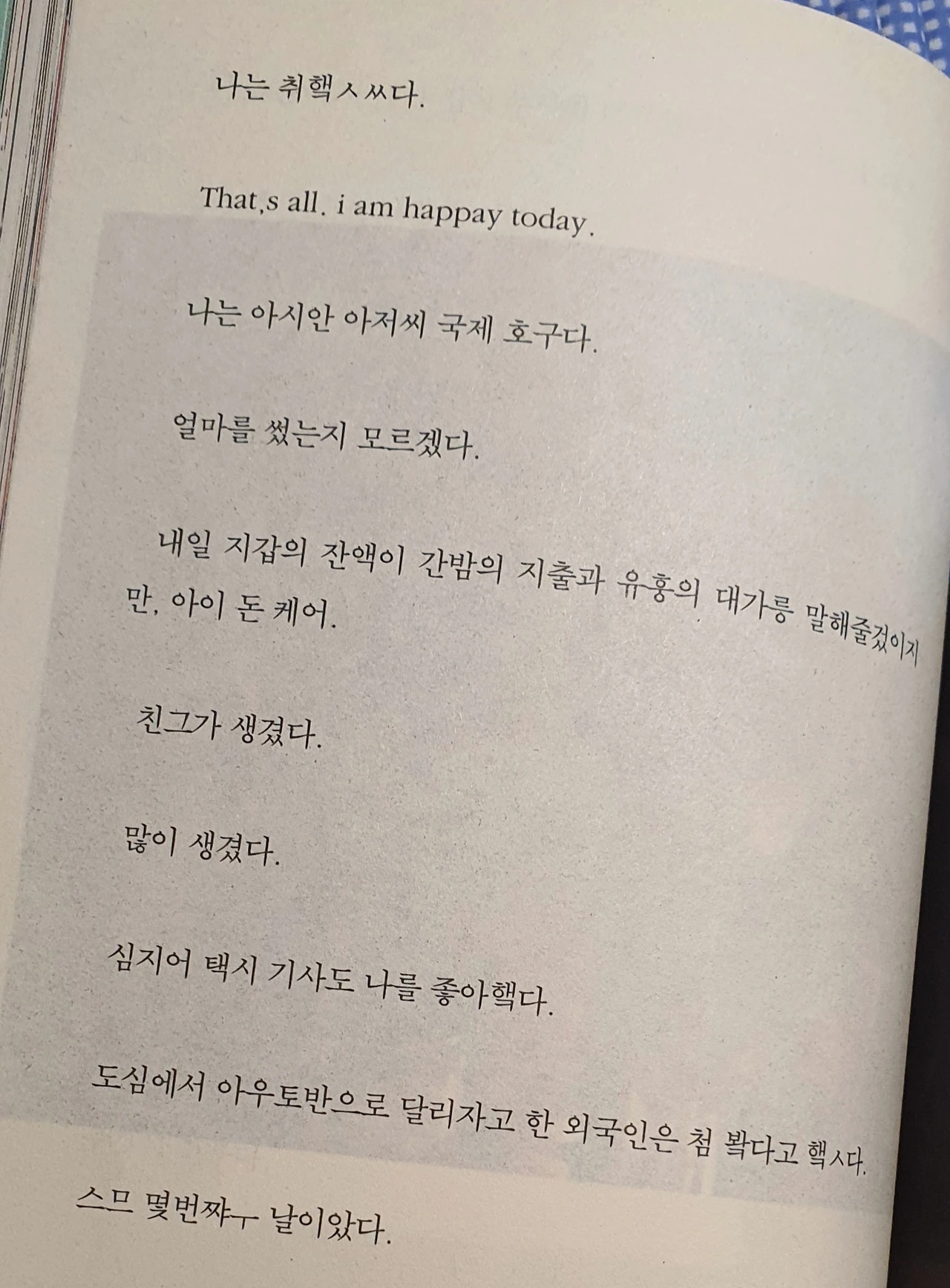 보통 에세이를 읽을 땐 내 마음을 건드린 부분에 밑줄을 긋고 페이지를 접지만, 이 책은 웃긴 부분에 자꾸 마음이 갑니다. 제가 제일 좋아하는 부분은 11월 4일. 새로운 친구를 사귀어 술을 진탕 먹은 밤에 핸드폰으로 마구 쓴 일기입니다. 이게 정말 등단한 작가가 출간한 에세이가 맞나 싶지 않나요? 와이파이를 연결하기 위한 고난(그의 말을 빌리면 '게르만 정보 참사'라 합니다)부터 할아버지 이발사에게 초코송이 커트를 당한 사건(이건 '게르만 두발 참사')까지. 웃긴데 왠지 쓸쓸한 베를린 생활을 따라가다 보면 자꾸 킥킥대며 읽게 됩니다.