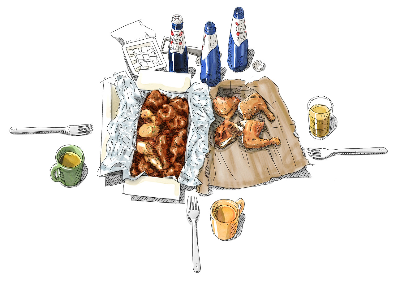 치킨을 먹을 때도 리듬과 박자가 존재한다. 처음에는 눈치 볼 거 없이, 각자의 리듬과 박자대로 먹기 시작한다. 그러다 어느 순간 서서히 느려지기 시작한다. 누가 얼마나 먹었는지, 언제 포크를 내려놓을 것인지 가늠해본다. 그날은 동생이 먼저 포크를 내려놓았다. 이제 남은 건 제부와 나. 제부는 양념을 집중적으로 먹었고, 나는 후라이드에 몰입해 먹었다. 게다가 난 닭다리를 두 개나 먹었다! 양념 하나, 후라이드 하나. 너무 많이 먹었나 싶었지만, 치킨 앞에서 내 이성은 이미 마비되고 말았다. 치킨을 한 조각 집을 때마다 나는 정중하게 물었다. “이거 먹어도 되니?” 그렇게 포기하지 않고, 조심스럽게 계속 먹었다. 끝까지 포크를 내려놓을 생각은 들지 않았다.