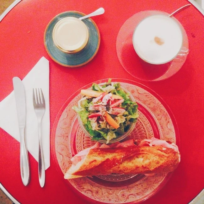 카푸치노와 설탕이 먼저 나오고, 잠시 후 샌드위치가 나왔다. 그리고 나는 이내 후회했다. 에펠탑 앞에서 바게트 샌드위치의 딱딱함을 느껴 놓고, 나는 왜 또 바게트 샌드위치를 시켰을까. 같이 나온 나이프로 빵을 잘라 보았지만, 잘 잘리지 않았다. 도대체 어떻게 먹으라는 건지…. 혼자인 것도 뻘쭘한데, 빵까지 내 맘대로 되지 않다니! 당황스럽기도 하고 짜증도 나는 이 상황이 웃기고 슬펐다. 혼자 바게트와 씨름을 하고 있는데 한국에 있는 친구들에게 카톡이 왔다. 이야기를 주고받다가 나는 이 딱딱하고 먹기 힘든 샌드위치의 사진을 찍어 친구들에게 보냈다. 친구들은 맛있어 보이는 샌드위치의 비주얼에 감탄했다.