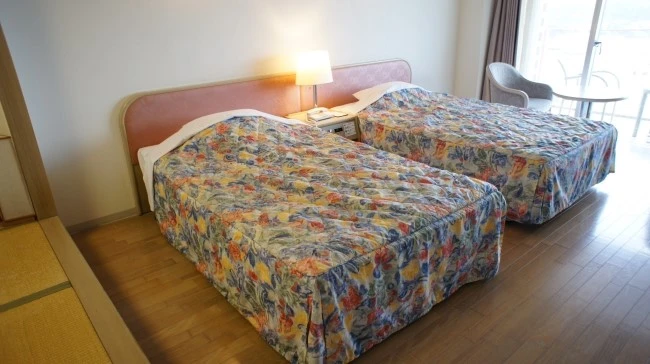객실에서는 수영장뿐만 아니라 바다도 보였다. 방은 다다미도 있고, 정말 넓었다. 침대 커버가 살짝 촌스러웠지만, 푹신하고 깨끗했다. 리조트가 좀 낡았다는 얘기를 여행 전 다른 사람의 후기에서 봤었는데, 건물이 오래돼서 복도 같은 곳은 확실히 낡아 보였으나, 내부는 전혀 그런 느낌이 들지 않았다.