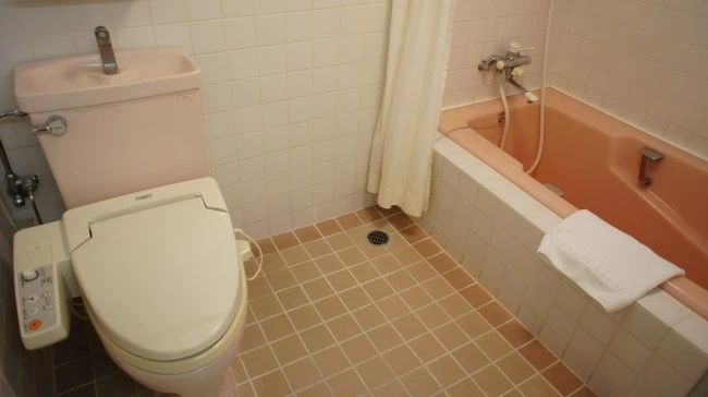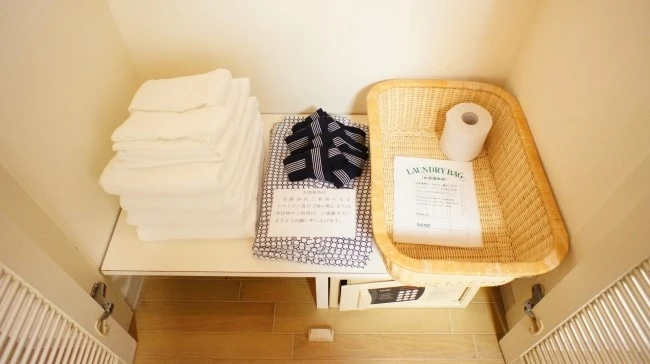 객실 문을 열고 들어가면 오른쪽에 작은 문이 있고, 그 문을 열고 들어가면 주방이 있다. 주방에는 물을 끓일 수 있는 전기렌지와 주전자, 컵 그리고 미니 냉장고가 있다. 그리고 바로 그 옆에는 세면대가 있다. 우리나라 사람들은 세면대와 화장실이 분리되어 있는 걸 어색해 하지만, 일본에서는 이런 구조가 더 고급이다. 세면대에는 간단한 세면도구 및 드라이기가 있었는데, 사실 드라이기는 바람이 너무 약해서 별 쓸모가 없었다. 그리고 세면대 옆에 접이식 문을 열고 들어가면 화장실이 나온다. 샴푸, 컨디셔너, 바디 샴푸는 기본적으로 구비되어 있고, 옷장 안에 있던 수건과는 별도로 발 수건이 놓여 있었다.