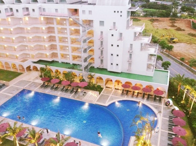 키를 받고 방으로 올라갔다. 호텔을 예약할 때 가장 높은 층으로 해달라고 요청했었는데, 운 좋게도 우린 9층의 제일 안 쪽 룸으로 배정받을 수 있었다. 방에 들어서자마자 테라스로 달려갔다. 이 리조트에서 가장 기대했던 게 바로 수영장이었기 때문이다. 비가 오고 있었지만, 몇몇 사람들이 수영장에서 수영을 즐기고 있었다. 이때부터 나는 설레기 시작했다.