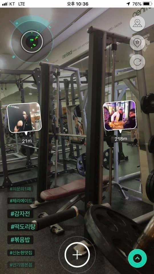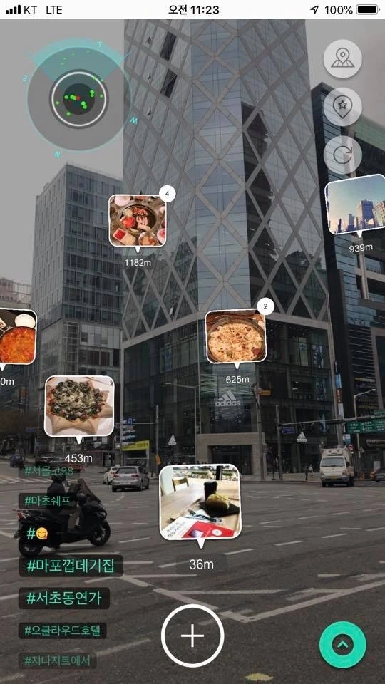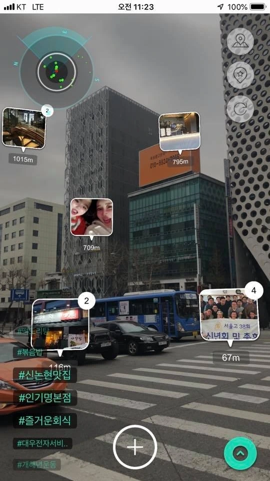 지금처럼 핸드폰을 열어 사방을 돌려보면 사람들이 이 주변에 다녀간 맛집, 옷집, 매장, 이벤트, 셀피 등 수많은 정보를 확인할 수 있죠. 저도 깔아보고 신기해서 이리저리 증강현실을 돌려보고 있습니다.