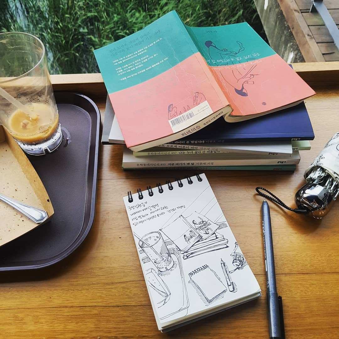 북카페에 가서 책을 잔뜩 골라 쌓아 두고는 결국 제일 처음 하는 게 그림 그리는 일이라 늘 골라온 책을 다 읽지는 못한다는 경험이 한가득. 그럼에도 책은 쌓아두고 읽는다. 같은 주제의 책을 여러 권 고르기도 하고, 제목이나 표지가 맘에 들면 일단 집어 든다.