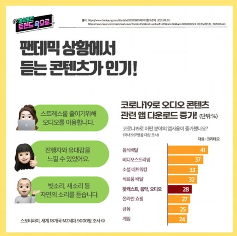 이런 상황 속에서 오디오 콘텐츠가 완전히 사라지는 건 아닌데요. 오히려 영상 매체의 피로감 속에 MZ세대부터 시작되는 오디오 콘텐츠가 인기를 끌고 있다고 하죠. 미국과 영국 등에서는 팟캐스트를 필두로 다양한 오디오 콘텐츠들의 광고 시장 규모가 해가 갈수록 늘고 있고, 국내에도 이런 오디오 콘텐츠 플랫폼에 대해서도 관심이 높아지고 있습니다.