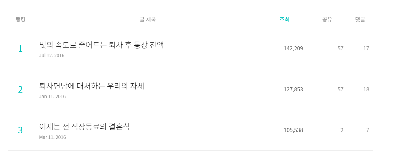 제 글의 Top 3 리스트입니다. 위 3개의 글을 포함해서 지금까지 77.5만 번 제 글을 읽어주셔서 다시 한번 감사드립니다. 과분한 관심에 용기를 얻어 브런치 출판에 여러 번 도전했지만 아직은 실력이 부족한가 봅니다. 이미 퇴사를 주제로 책을 내고 창업한 분들이 있어 더 이상 흥미로운 소재가 아니었을 수도 있습니다.