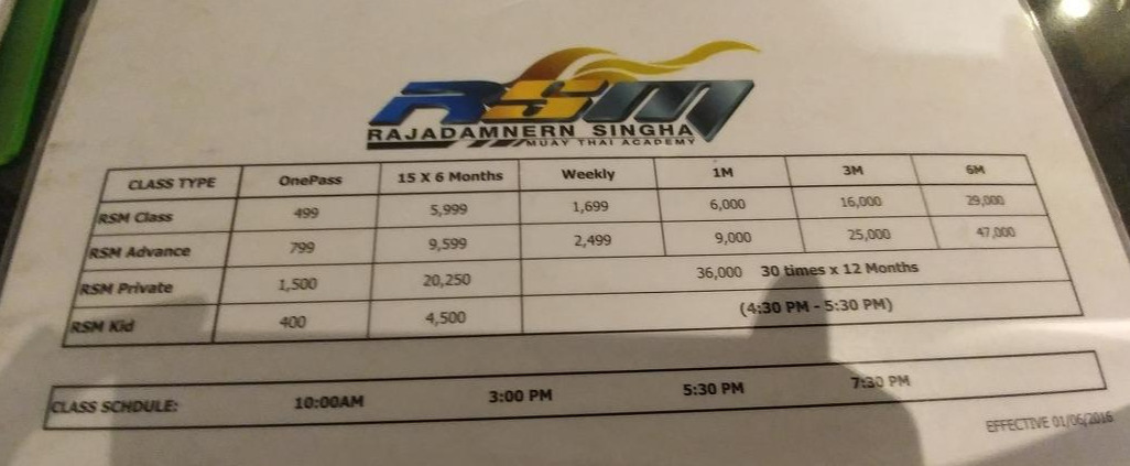 가격은 홈페이지와 동일했다. 한 번 수업에 499바트로 한국 돈으로 환산하면(1바트 33원 기준) 16,467원이다. 하지만 내가 선택한 1주일 무제한 수업료는 1,699바트이다. 한국돈으로 56,067원이다. 유적지 방문으로 아침 일찍부터 움직인 하루를 제외한 6일 동안 무에타이를 배웠으니 회당 만 원이 안 된다.