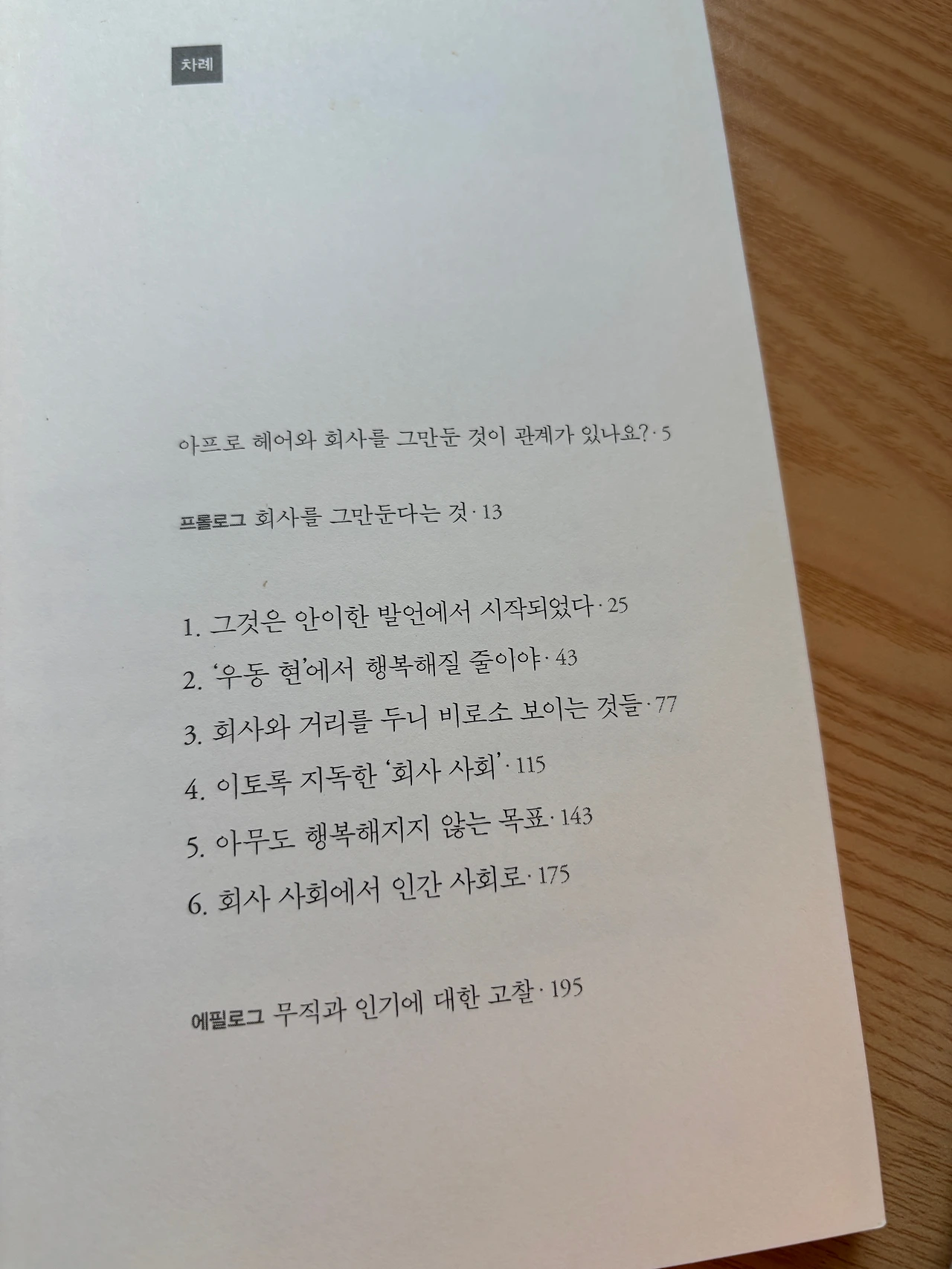 목차는 생각보다 간결합니다. 책 자체도 203페이지 분량으로 길지 않지만 목차조차 미니멀로 정한 건가 싶었습니다.