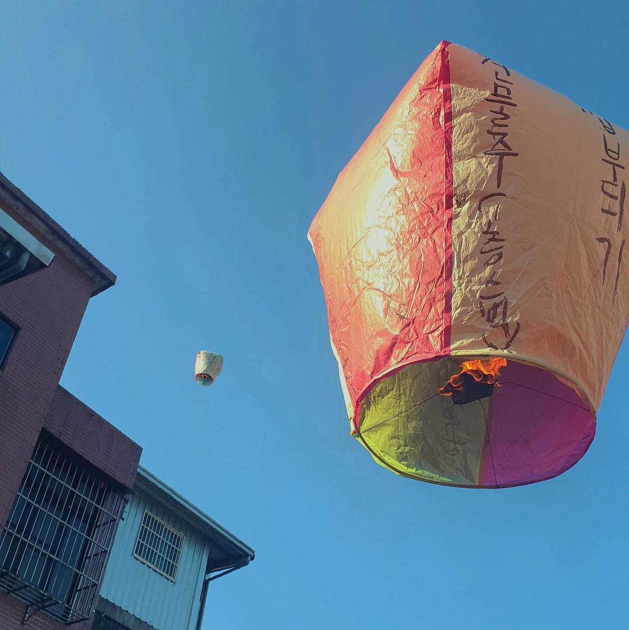 스펀에서 유명한 건 풍등이랑 닭날개 볶음밥이다. 고속버스에서 내리자마자, 하늘 위에는 풍등 여러 개가 둥실둥실 떠다녔다. 2인 1조가 되어 풍등에 소원을 적고, 기찻길 위에서 띄운다. 이 기찻길은 정말 기차가 다니기 때문에 기차가 올 때쯤이면 모두 사람들이 옆으로 비켜선다. 풍등의 붉은색은 건강과 평안, 분홍색은 행복, 초록색은 성공기원, 노란색은 재물을 뜻한다. 가이드가 말하길, 간혹 풍등에 불이 잘못 붙어 망가지는 경우가 있다고 한다. 이 경우는 지극히 적고, 그런다 해도 당황하지 말고 한 번 더 만들면 된다고 한다. 나는 고속버스에서 짝이 되어 앉은 사람과 함께 풍등에 글을 썼다. 노란색에 '건물주(1층 스벅)'이라는 거창한 소원을 썼다. 그 분과 함께 기념 촬영하고 띄우는데... 가이드가 말하는 지극히 적은 경우가 발생했다. 우리 풍등에 불이 잘못 붙어 처참하게 구겨졌다. -그래서일까. 아직 내가 건물자가 되지 못한 게.- 가이드가 미리 언질 하지 않았다면 무척 당황했을 것 같다. 우리는 가이드의 말대로 침착하게 한 번 더 적어 풍등을 띄웠다.
