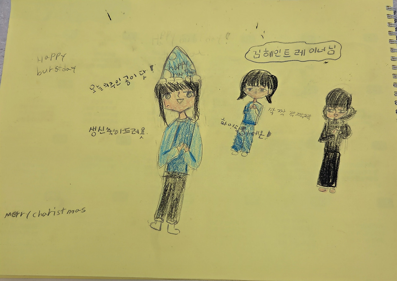 케이크를 먹은 후, 나와 아이들은 다시 우리 교실에 들어와 아까 못다 한 이야기를 시작하려고 할 참이었다. 그때 한 아이가 자신의 휴대폰 뒤에 붙어 있던 스티커를 떼어 자신이 아끼는 거라며 나에게 주려고 했다. 괜찮다고 몇 번을 이야기해도 아이는 이미 내 휴대폰 어디에 붙여주면 좋을지 유심히 살펴보고 있는 중이었다. 결국 내 휴대폰 그립톡 정중앙에 아이가 준 스티커가 붙게 되었다. 그러더니 나를 그려준다고 했다. 너무 좋은 선물이라는 생각에 그림 그리기 시작한 아이를 가만히 쳐다보고 있었다. 내 옆에 다른 아이가 앉았다. 그 아이도 그림을 그리는 친구의 모습을 가만히 쳐다보고 있길래 "너도 선생님 그려줘."라고 요청했다. 아이는 기다렸다는 듯이 "아, 못 그리긴 하는데." 하면서 스케치북을 펼쳤다.