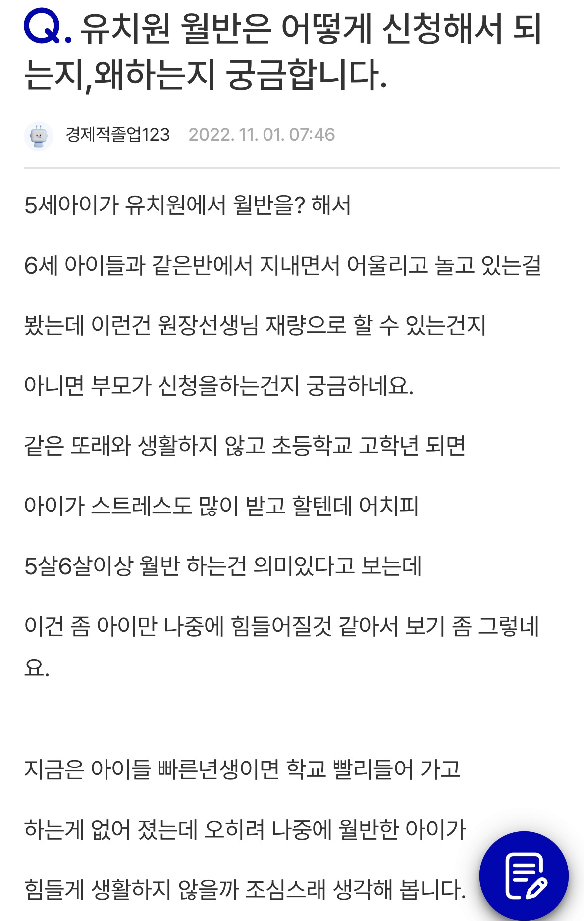 나는 첫째 딸이 5세(53개월)가 되었을 때, 3월도 아닌 9월에 처음으로 기관에 보내기 시작했다. 그것도 6세 반으로 월반하면서(이 과정도 정말 순탄치 않았는데 그 이야기는 다음에 주제 하나를 할애해 써볼까 한다.) 말이다. 내가 5세에 6세로 월반시킨 경험이 있는 엄마라 그런가 이런 글을 만나니 마음이 편치 않았다. 그래서 이분의 글에 답을 달아보며 월반 및 조기입학에 관한 내 생각을 말해보려고 한다.