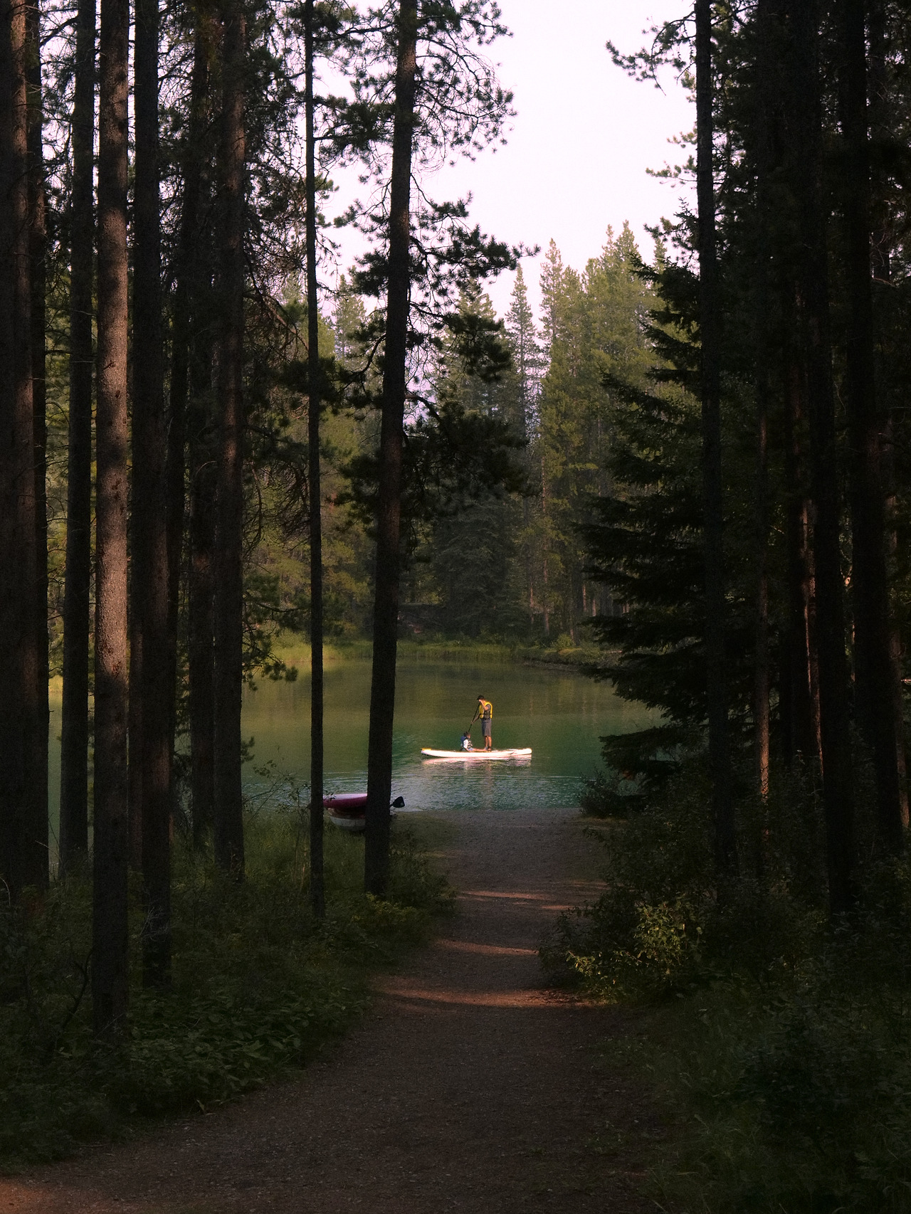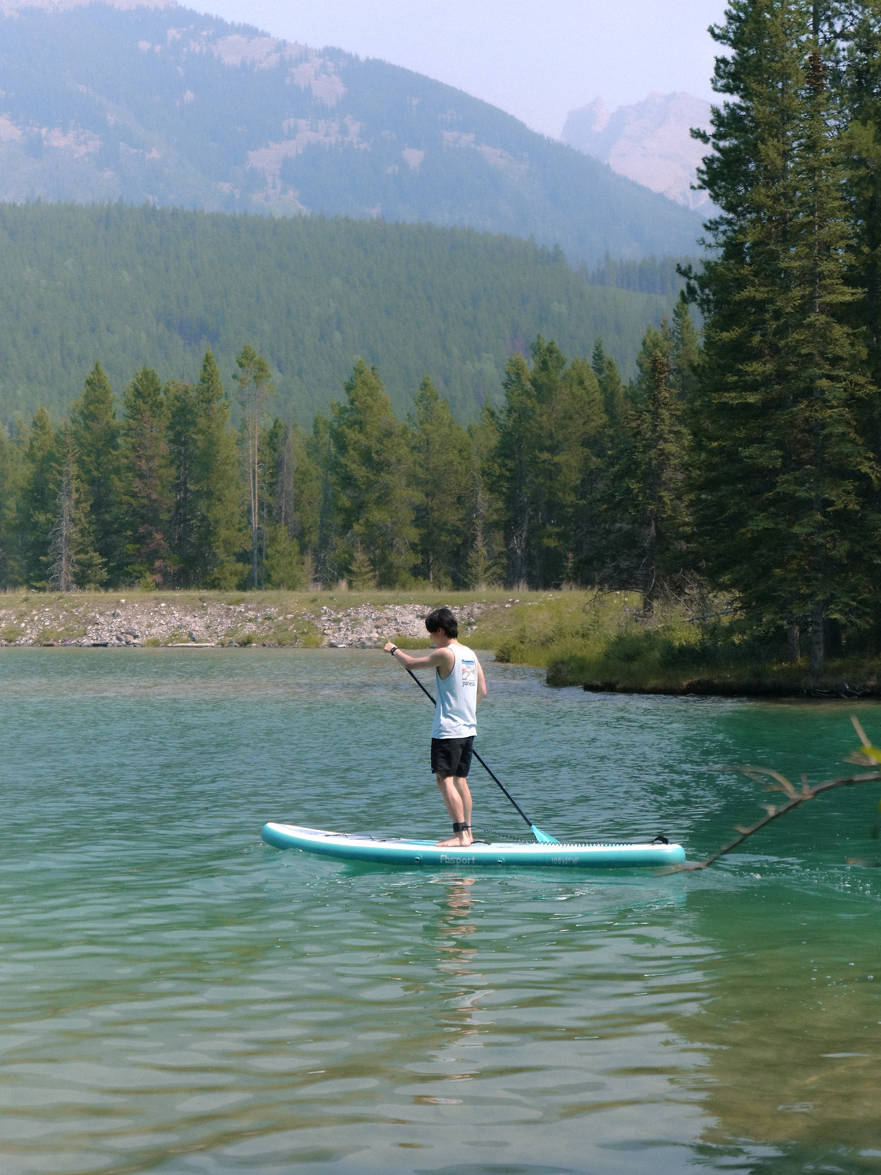 투 잭 레이크 캠프사이트를 비집고 들어가 울창한 나무들 사이를 지나니 에메랄드빛 호수가 나타났다. 잔잔한 물이 흐르고 따뜻한 햇살이 비추는 호수가에 자리를 잡고 돗자리를 폈다. 나는 이것저것 준비해 온 것들을 꺼내고, J는 패들보드에 바람을 넣기 시작했다.