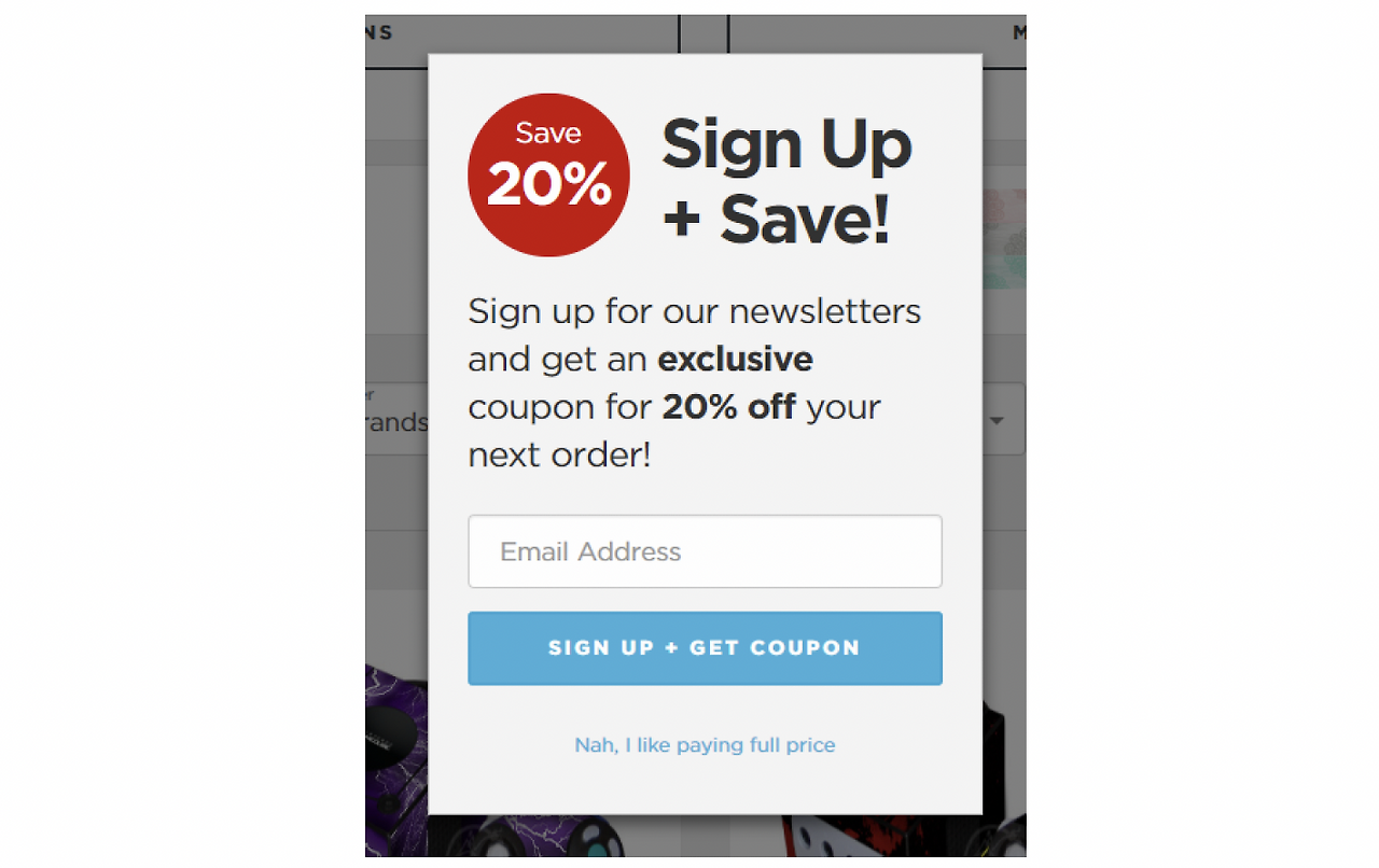 위 그림은 Confirmshaming의 실제 사례 중 하나로 뉴스레터를 수신하면 할인 쿠폰을 준다면서 이메일 주소를 입력하도록 하는 경우입니다. 가입 진행 버튼 밑에 작은 크기로 거절 버튼이 ‘Nah, I like paying full price(아니, 나는 정가를 지불하는 것을 좋아한다)’라는 문구로 되어있습니다.