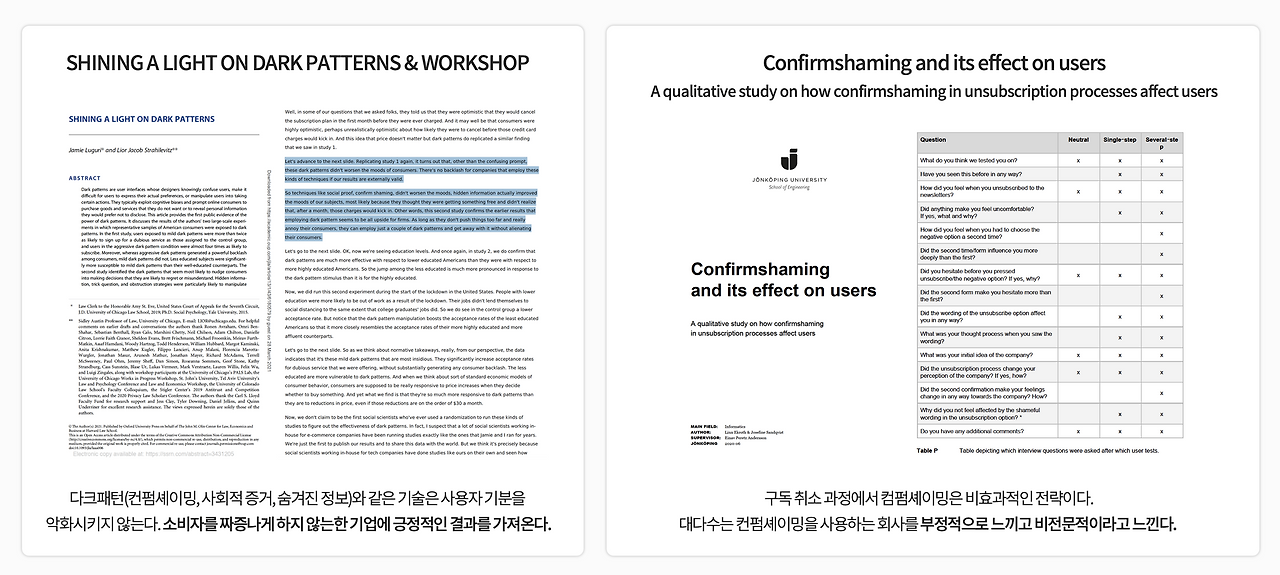 Confirmshaming에 대해서도 한 연구자는 '소비자를 짜증 나게 하지 않는 한, 기업에 긍정적인 결과를 가져온다.'는 결과를 도출했고, 한 연구자는 '대다수는 Confirmshaming을 사용하는 회사를 부정적으로 느끼고 비전문적이라고 느껴서 비효과적인 전략이다'라는 결과를 보여주고 있습니다.