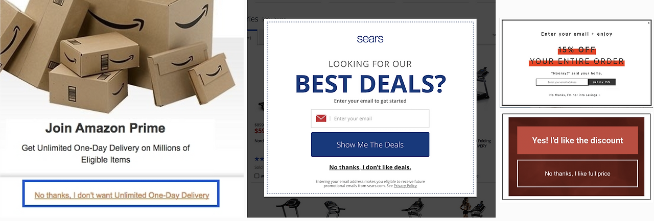 위의 예시만 하더라도 특정 서비스에 가입 혹은 이메일을 수신해서 혜택을 받으라는 내용인데, 모두 거절 문구가 "괜찮다. 나는 서비스(혹은 혜택)를 좋아하지 않는다."라고 되어있습니다.