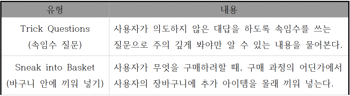 다크패턴 디자인 정의 및 유형 | 사용자 기만 디자인 https://gardendesign.tistory.com/58