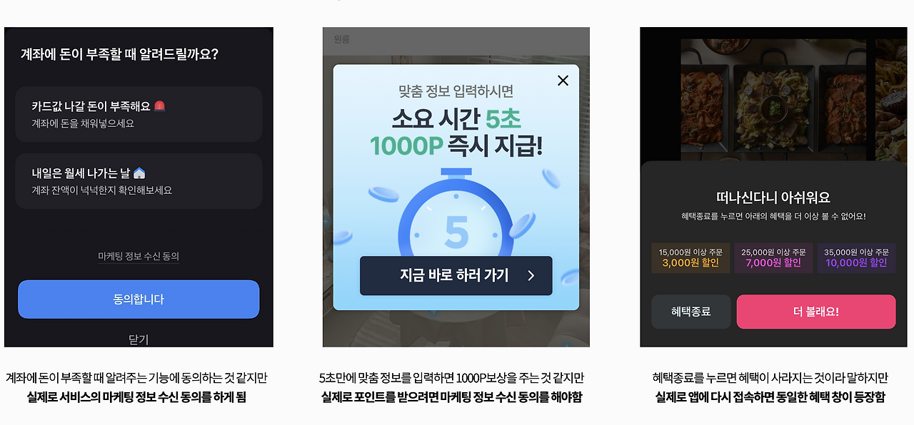 1) 왼쪽, 토스 : "계좌에 돈이 부족할 때 알려드릴까요?"라는 타이틀만 봤을 때는 정말로 계좌에 돈이 부족할 때 알람이 오는 서비스 같지만, 설명 아래에 '마케팅 정보 수신 동의'가 필수로 설정되어 있고 [동의하기] 버튼을 누르면 마케팅 정보 수신에 동의하게 되는 겁니다. 결국, 계좌에 돈이 부족할 때의 알람은 물론이고 토스의 각종 마케팅 정보들도 함께 수신하게 되는 거예요.