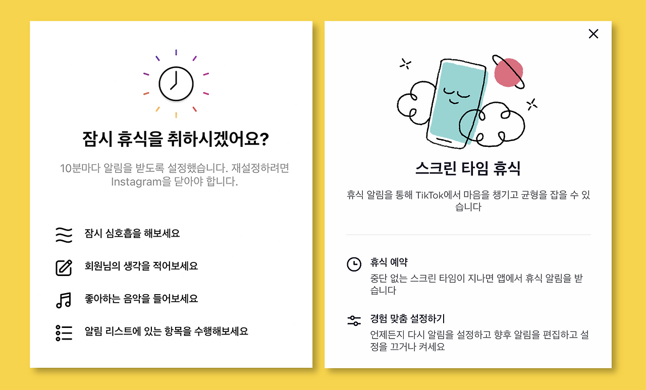 이미 도파민 폭발 콘텐츠를 많이 생성하고 배포하고 있는 인스타그램, 틱톡, 유튜브는 사용자가 일정 시간 이상 서비스를 사용하면 잠시 휴식해 보라고 권고하고, 심호흡하거나 좋아하는 음악을 들어보라고 제안하기도 합니다.