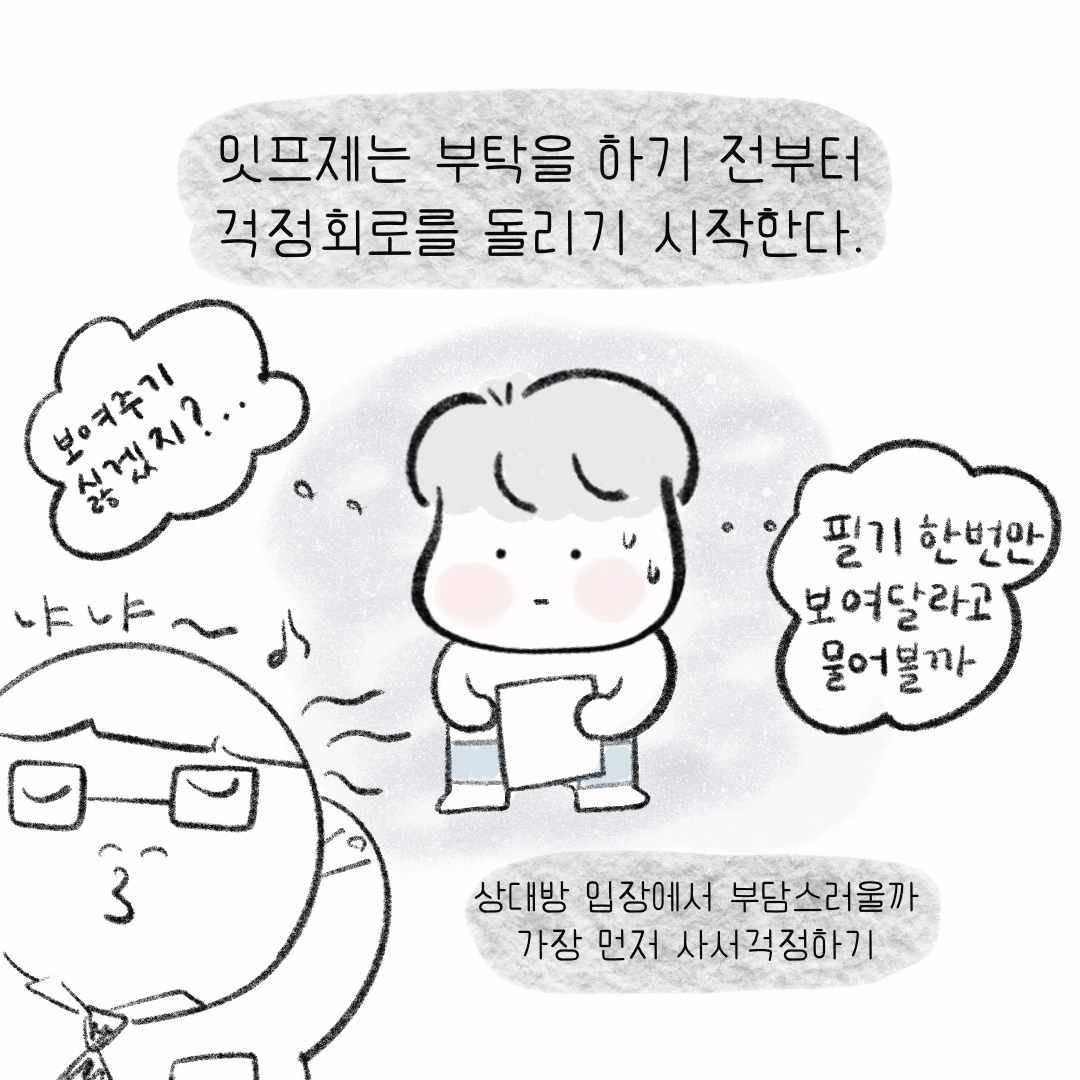 종종 생각이 많아서 부탁하는 말을 꺼내기 까지 꽤 오랜 시간이 걸린다. 내가 이 부탁을 받는다면 상대가 어떤 생각과 감정을 가질까..?