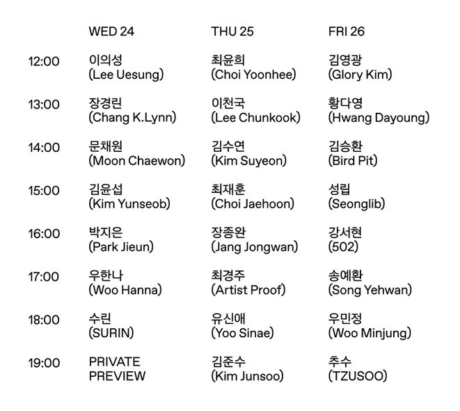 인지-경험-소장에 이르는 일련의 과정을 통해 총체적인 경험을 제공하는 이번 써킷 서울에는 총 23팀의 작가가(Bird Pit, SURIN, 강서현(502), 김수연, 김영광, 김윤섭, 김준수, 문채원, 박지은, 성립, 송예환, 우민정, 우한나, 유신애, 이의성, 이천국, 장경린, 장종완, 최경주, 최윤희, 최재훈, 추수, 황다영 )참여한다. 기존의 감상 방식을 탈피한 써킷 서울의 쇼 타임▼을 놓치지 말자!