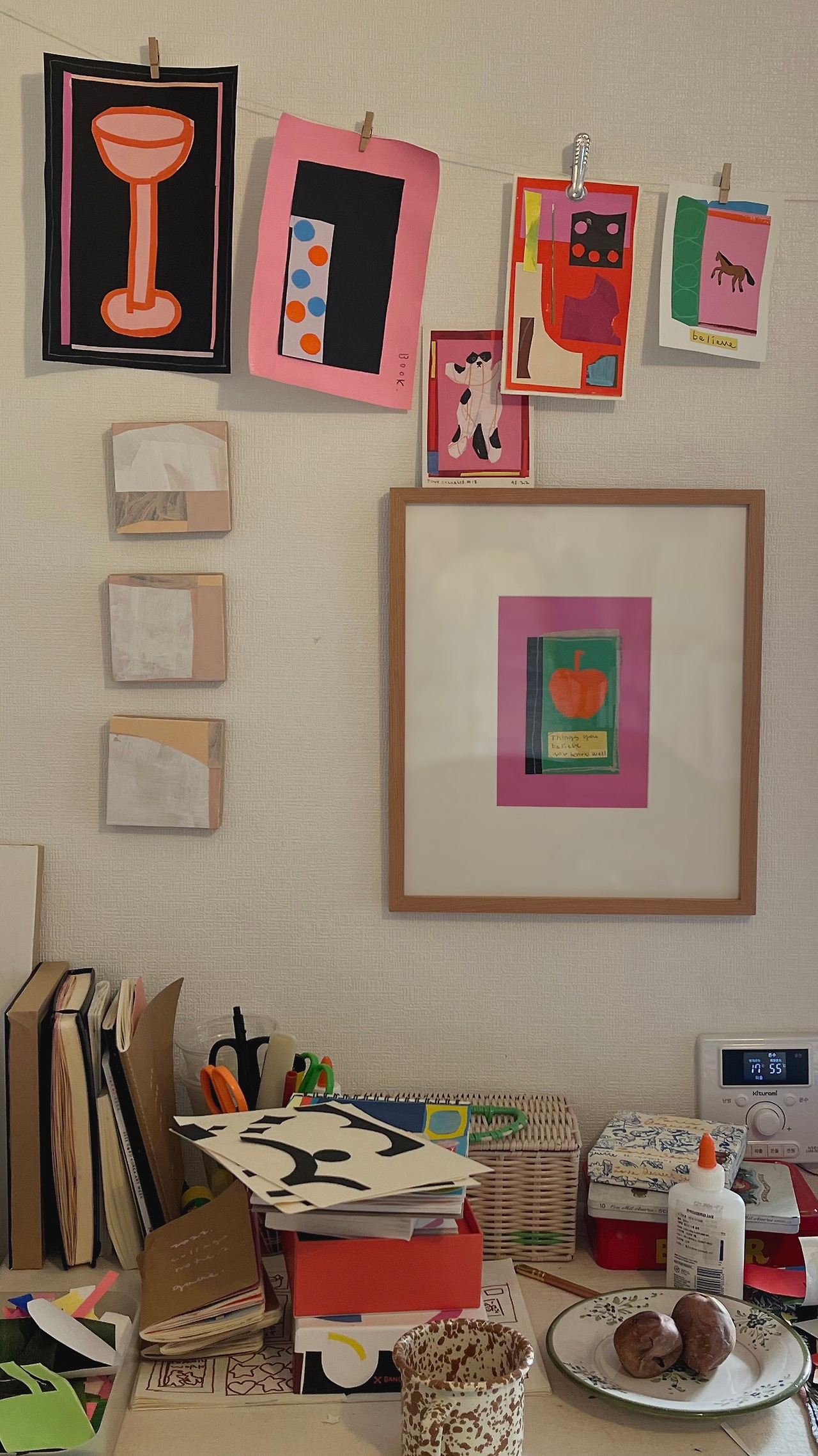 이곳에 작업실을 꾸린지는 3년 정도 되었어요. 좋아하는 것들로 하나하나 채우다 보니 이렇게 되었네요. 아침에 오면 우선 커피를 한잔 끓여 마셔요. 예전에는 메일 확인 같은 급한 업무들을 먼저 처리하곤 했었는데 얼마 전부터 콜라주북을 먼저 채우는 것으로 루틴을 바꿨어요. 하루에 조금씩이라도 작은 노트에 콜라주 작업을 합니다. 그러고 나면 금방 점심시간이 되고, 외주 작업을 좀 하다 보면 아이를 하원 시킬 시간이에요. 하루가 바쁘게 지나갑니다.