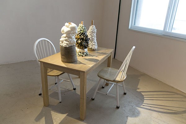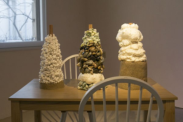첫 번째 공든탑인 <공든탑Ⅰ>은 돌탑의 원형을 적극적으로 차용하되 자연의 돌이 아닌 건축적 재료를 사용했다. 마치 건물의 기둥 같은 나무 각재를 중심으로 우레탄 폼과 모래, 자갈 등을 오랜 시간 공들여 쌓아올렸다. 모래 한 톨, 자갈 한 알과 엉겨 붙은 우레탄 폼은 테이블로부터 더 멀리, 더 높이 솟아오르고자 처절하게 매달린다. 주목해야할 것은 탑이 놓인 장소와 그 규모다. <공든탑Ⅰ>은 가정에서 흔히 볼 수 있는 식탁 위에 놓여있다. 방 한편에 놓인 테이블은 개인적인 관계를 가능하게 한다. 그 관계는 얼굴을 마주하고 손을 뻗으면 닿을 수 있는 거리에서 일어날 수 있는 규모의 사적인 해프닝이다. 마주보고 앉은 누군가는 마치 장기말을 두듯 신중한 태도로 다양한 재료를 쌓아올렸을 것이다. <공든탑Ⅰ>은 수행자에게 허락된 공간의 크기만큼 가능성의 여지를 남긴다.