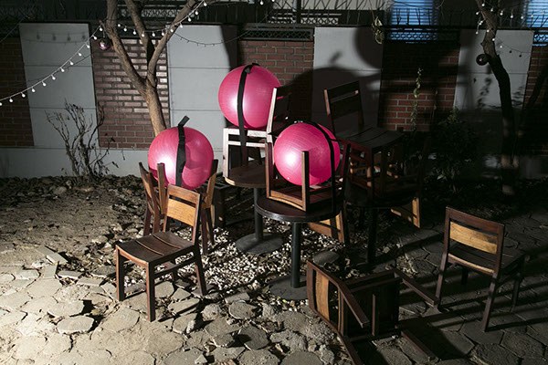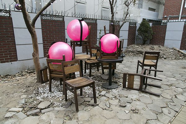 <공든탑 Ⅱ>은 전자의 공 功 들인 탑을 부정하고 <공든탑Ⅰ>을 뒤집고 부풀린다. 말 그대로 ‘텅 빈空 공ball을 든 탑’이라는 의미도 되는데 처음의 성실한 노력을 비웃기라도 하듯 고무공에 펌프로 공기를 주입해 손쉽게 커다란 탑을 만들었다. 가벼운 고무공들은 여러 개의 의자와 결합해 어지럽게 놓였다. 의자들은 뒤집히거나 누워버려 원래의 역할을 상실하고 그저 공을 두기 위한 수단이 된다. 엔트로피는 증가하고 공든탑은 무질서해진다. <공든탑 Ⅱ>는 사적인 공간을 넘어 공公 적 실외 공간에 배치되어 관계를 확장시킨다. 강렬한 색을 가진 가벼운 공은 존재감을 과시하고 유희하며 구른다.