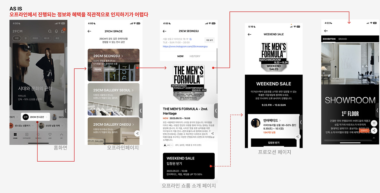 29cm의 오프라인은 지점마다 브랜드가 바뀌고 기간도 각자 다르다. 따라서 지속적으로 업데이트를 제공해야 하는데 현재는 유저가 그 정보를 확인해야 한다. 또한 위에서 말했듯 간단한 정보(기간,이벤트 등)를 확인하기 위해서는 2뎁스를 지나야 하는 허들이 존재한다.