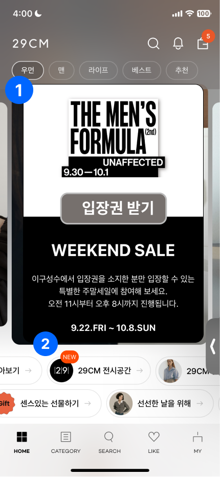 유저는 홈화면에서 '29cm 전시공간' 을 통해 오프라인 페이지를 확인할 수 있다. 하지만 유저가 오프라인 공간에 대한 정보 (업데이트/기간/이벤트 등) 를 알려면 2뎁스를 지나야 한다.