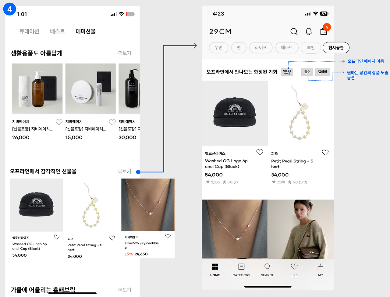 2. 바로가기 아이콘을 선택하면 오프라인 매장 페이지로 이동하게 했다. 단순히 상품만 구경하는 것이 아닌 29cm의 브랜딩을 볼 수있는 오프라인 페이지를 경험하게 하는것도 중요하기 때문이다.