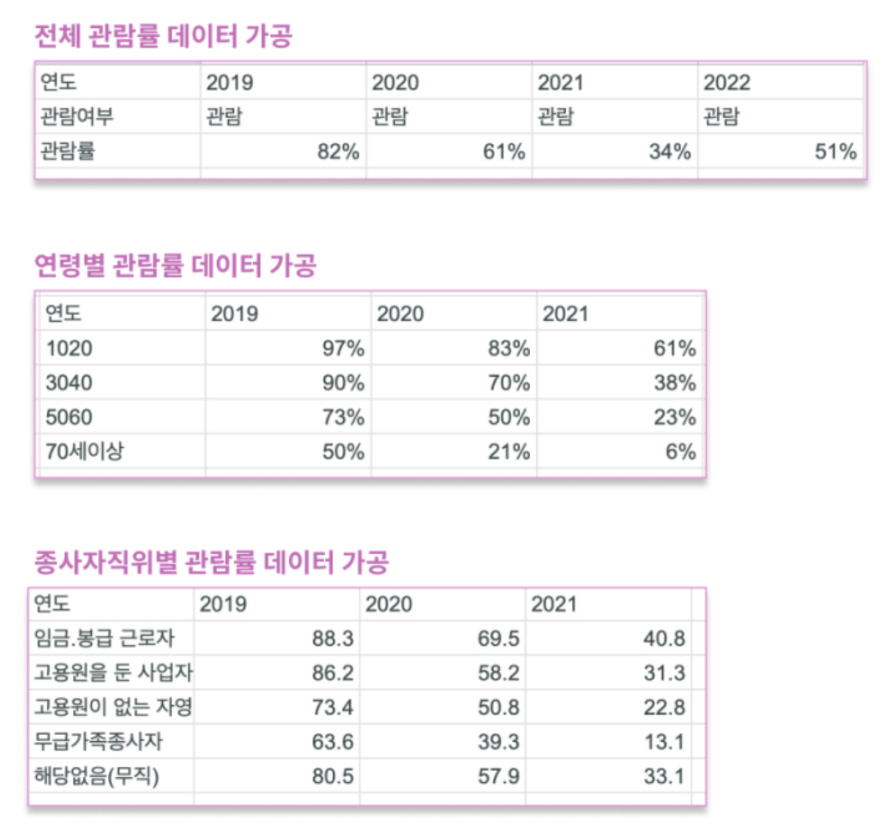 2019-2022 전체 관람률로, 특히 코로나 이전과 이후 관람률 변화를 통해 2023년 마스크착용 해제 이후 관람률을 유추해 볼 수 있을 것이다.