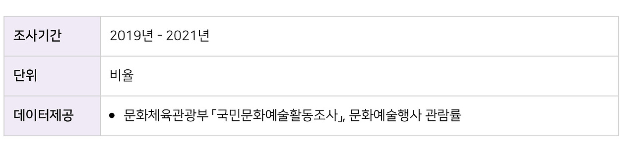 일단 사람들이 문화예술을 얼마나 향유하는지 알아야 앱 제작여부가 결정되고, 또 어떤 종류가 시장에 적합할지 파악되기 때문에 수요 조사를 위해 '문화예술 행사 관람률' 데이터를 열람했다.