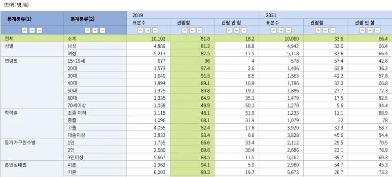 그래프에 의하면 2019년도와 2021년도의 유급/봉급 근로자 관람률은 47.5%로 다른 지위보다 적게 하락한 건 맞지만 무직도 이와 비슷한 47.4%가 나왔다. 0.1%의 근소한 차이다. 따라서 프로모션을 진행할 때 근로자의 참여뿐만 아니라 무직의 참여율도 높을 수 있다.