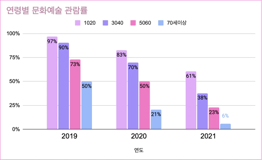 문화예술을 가장 많이 향유하는 사람이 누굴까? 필자는 청소년과 20대라고 생각했다. 우선 청소년은 학교에서 숙제로 작품을 감상하게 하는 일이 많다. 또한 문화예술은 현트렌드와 가장 밀접하다고 할 수 있으므로 트렌드를 좇는 20대의 성향상 문화예술 관련 서비스의 유입률이 가장 높을 것으로 판단했다.
