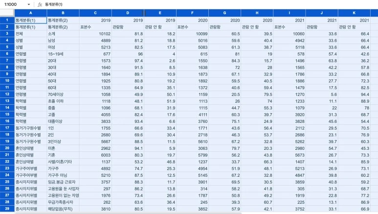 문화예술 관람률의 law data를 가져왔다. 전체 응답수 및 성별,연령,학력,동거가구원,혼인,종사자 등 여러 분류로 나누어져 있다. 필자는 전체 관람과 연령 및 종사자 직위별 관람률만 필요하므로 그 외의 데이터는 삭제 후 가공하기로 했다.