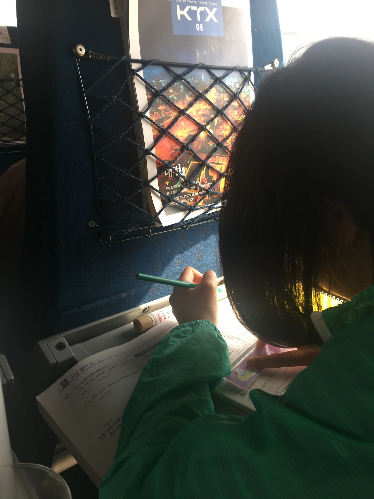 네 살쯤 같이 탔을 때는 옆 칸에도 가보자, 창 밖을 보자, 화장실도 가보자는 녀석 때문에 특별히 KTX가 엄청 편하다는 생각은 못 했는데, 나란히 앉아서 챙겨간 간식을 순서대로 알아서 꺼내 먹고, 중간엔 수학 숙제까지 한다고 문제집을 펼치는 너를 보니 감개가 무량하구나. (물론 다섯 문제 정도 풀고 다시 넣긴 했으나, 그 잠깐 황홀했었다. ㅋ)