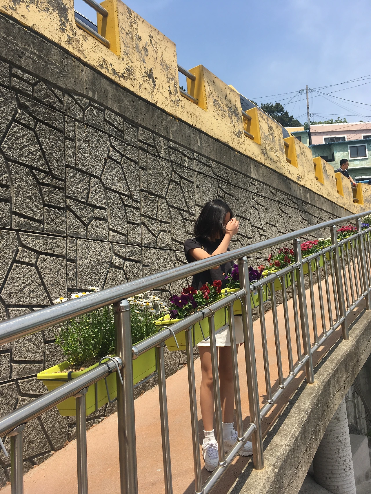 주차는 힘들었으나 감천마을은 동양의 산토리니라 할 만큼 아기자기 알록달록 이뻤다. 물론 이제 너무 유명한 관광지가 되어, 서울이나 여기나 차이나 타운이나 통영 동화마을이나 할 것 없이 국적 불명의 기념품 파는 가게들로 살짝 실망할 때쯤, 하늘 마루에서 올라가 밖을 내다보면 와~ 할 수밖에 없는 풍경이다. 한쪽에 바다가 펼쳐져 있고, 쪽으론 오밀조밀 집들이 서로 시야를 언덕에 가지런히 늘어선 모습을 보니 감탄이 절로 나온다. 6.25 전쟁 후 피난민들이 하나둘 몰려들어 집을 지어 만든 동네라는데, 그 배고프고 힘든 시절에 여기를 어떻게 걸어 올라와 집을 짓고, 매일매일 이 길을 몇 번을 오르락내리락했을까 생각만 해도 아득해진다. 지금은 환골탈태해서 온갖 국적의 관광객들이 모이는 핫플이라고 하지만 전쟁을 피해 맨몸으로 부산에 와서 산꼭대기에서 시작하는 하루에 이 풍경이 보이기나 했을까, 딸애에게 아마 몽실언니가 부산 와서 살던 집이 이쯤 되지 않았을까 하며 어른다운 척을 해볼까 했으나 엄마 얘긴 들었는지 말았는지 무슨 생각을 했는지는 딱히 모르겠다.
