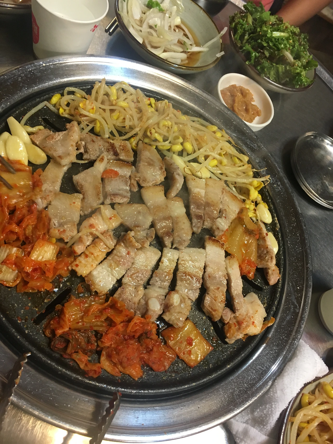 사실 여행지 고민 중에 제일 큰 게 그거 아니 뭐 있나? 특별한 것을 먹고 싶었으나 점심을 너 무 많이 먹었고, 소화도 안 됐고, 특별한 걸 먹으러 차로 30분쯤 가려면 아이들이 싫어할 테고 나는 그저 맥주 한 잔이나 하고 싶었으나 애들은 또 밥을 먹어야 하니 그냥 숙소 근처에서 간단히 해결하기로 한다. 간단히 해결하려고 했으나 숙소 아주머니가 추천한 삼겹살 집은 숙소 바로 옆에 있었고, 삼겹살은 어지간하면 실패하기 힘든 메뉴 인터라 배도 안 고픈데 또 너무나 맛있게 먹었구나. 배부르면 맥주 못 마시는데 ㅎㅎ.. 경남 소주를 한 잔 하려 했으나 내 입엔 너무 쓰고, 삼겹살에 콩나물 구워 먹으니 꿀맛이네.