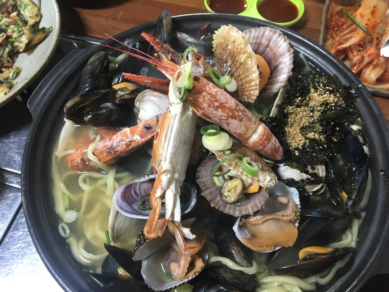 저녁으론 김해 맛집이라는 해산물 칼국수를 먹고, 칼국순데 해산물이 해물탕처럼 들어 있어 깜짝 놀라고, 마트에서 각자 먹고 싶은 간식들을 사서 첫날밤을 보내기로 한다.