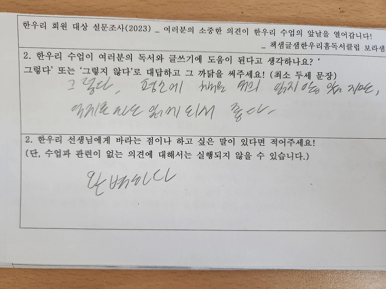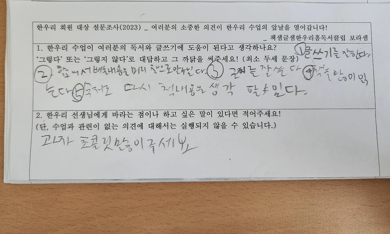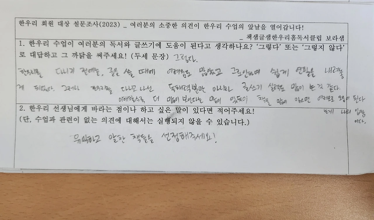 아이들은 왜 한우리 수업과 선생님이 좋다고 하는 걸까요? 그 까닭이 궁금해 직접 물어본 적이 있습니다. 그런데 저와 눈을 맞추며 말하는 게 쑥스러운지 아이들의 대답은 ‘재밌어요’ ‘그냥 좋아요’ ‘선생님이 친절해요’ 정도가 대부분이었습니다. 아무래도 속마음을 들으려면 방법을 바꿔 봐야 할 것 같아, 작은 종이에 질문 두 가지를 적어 건넸습니다. 첫 번째 질문은 ‘한우리 수업이 여러분의 독서와 글쓰기에 도움이 된다고 생각하나요? 그렇다면 그 까닭을 써주세요.’, 두 번째 질문은 ‘한우리 선생님에게 바라는 점이나 하고 싶은 말이 있다면 적어주세요!’ 였습니다.