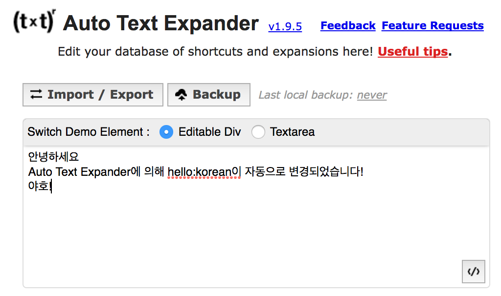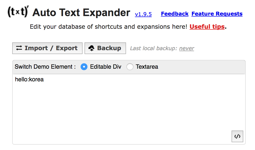 2) 텍스트의 연속 입력을 감지하는 방식으로 문구 변환이 이루어집니다. hello:korea 까지 작성하고 나중에 n 을 덧붙이는 등의 동작은 이루어지지 않습니다. 이때는 새로 작성하거나, 지웠다가 작성해야합니다.