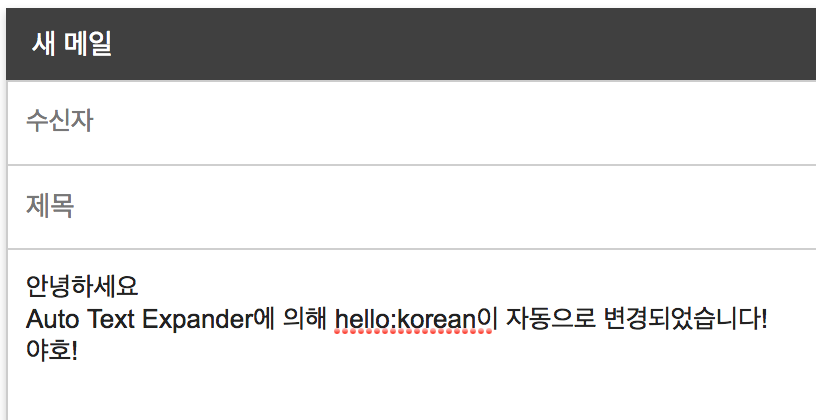 hello:korean을 입력하면 Auto Text Exapnder 가 인식해서 미리 준비한 문구로 변경하게 될 것입니다. 스크린샷을 찍기 위해 n 을 적지 않은 상태입니다.
