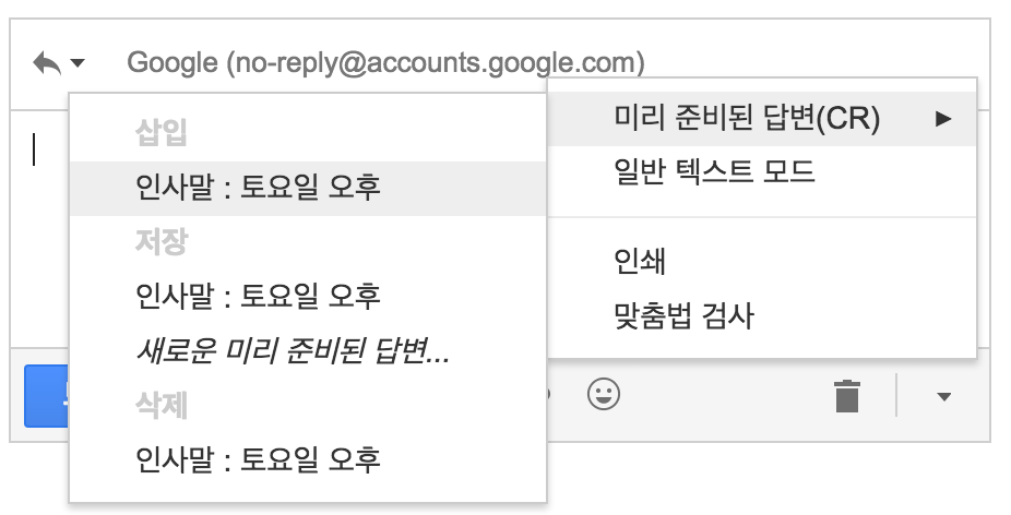 해당 기능을 활성화하게 되면 지메일 답변 입력란데 작은 화살표가 생깁니다 (오른쪽 아래) 해당 화살표를 누르면 미리 준비된 답변(CR)이 표시됩니다. 스크린샷은 토요일 오후의 인사말을 미리 등록해둔 모습입니다.