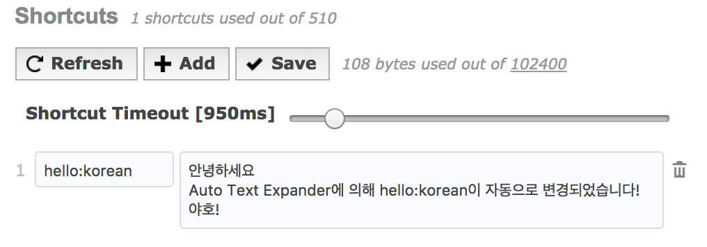 3) 지정한 초 내에 해당 단축문구가 입력되어야합니다. hello:korean 이 0.95초 안에 작성될 겨우 텍스트 변환이 이루어집니다. 따라서 본인의 타이핑 속도에 맞춰 Shortcut Timeout 을 조절해야합니다. 제 경우에는 데스크탑은 700ms 노트북은 950ms 로 이용하고 있습니다.