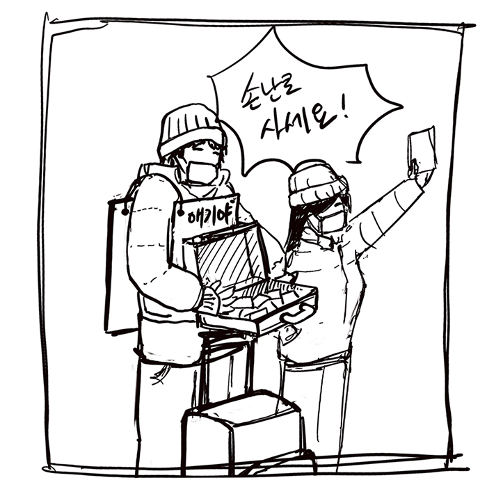 우리가 판매한 손난로를 여기저기서 흔들고 있었다. 그것이 홍보효과가 되어서 더 많은 사람들이 우리 상품을 찾았다. 누가 물어보고 우리 커플 쪽을 손으로 가리키는 모습을 볼 때마다 마스크 속에 입꼬리는 씩 올라갔다. 그런데 그때였다. 어떤 우리 기존 고객이 손난로를 흔들면서 우리 쪽으로 왔다.